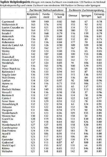 Recently we had some problems with the FN rankings, especially with the jumping sires. If you take the example of Donnerhall, he only has very few horses in jumping competition, but if they are very good horses, then he can get a very high jumping index. Another example would be Wenzel who has had about three hundred horses successful in dressage but only ten that were successful in showjumping. Of these ten, two went up to Grand Prix level in jumping, and so Wenzel received a relatively high jumping score. But it is not accurate when you take into account the very low number of jumping horses he has produced within his overall progeny. Because they do not expect Wenzel progeny to jump, it is only the exceptional very good jumpers that are given the opportunity to compete. Unfortunately the FN figures do not take into account the level of participation, and so that can give a rather distorted picture.